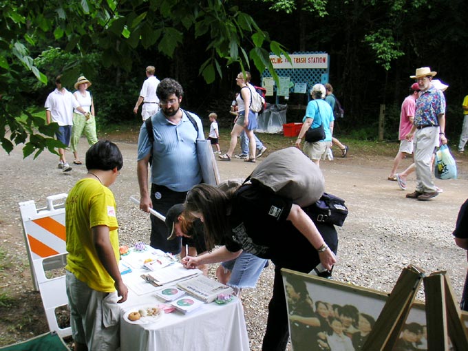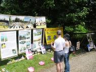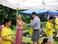![]() 法轮功展台 | ![]() 游人在呼吁停止迫害法轮功的请愿信上签名 |