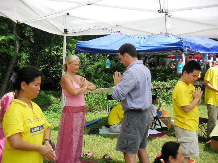 一位一直在寻找人生真谛的女士苦于在宗教中很难找到净土,当看到学员们在酷热下安静的炼功场面很受触动,和一个西方学员交谈后感慨万千,表示要修大法,并当场学了功法。
