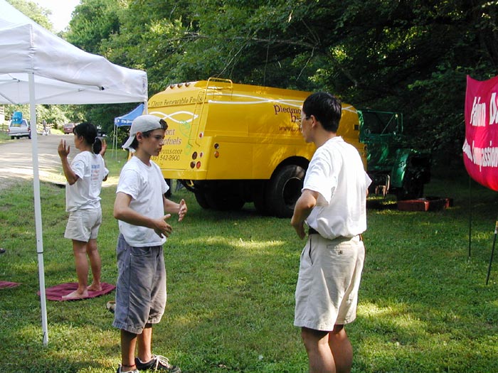 一位初中生几乎读完了展台上的资料,认真的签了信,当得知学员可以现场教功时,他马上表示要学,并学的非常认真。三个十岁左右活泼可爱的女孩子问多大才可以签名,当知道她们也可以签时,非常高兴的签了字并拿了真象材料。