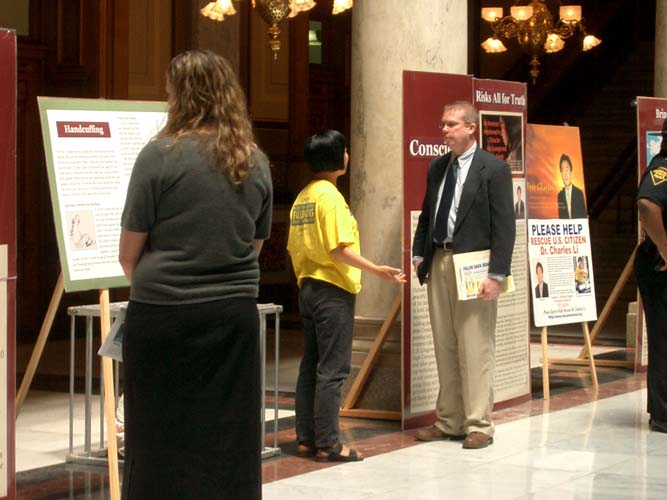 一位从欧洲来印州作短期访问工作的先生,一日观赏夏日街景,阴错阳差的走進州政府大楼,刚一進来就感到极强的能量场,随即便是映入眼帘的模拟刑具及酷刑图板。当学员们给他介绍法轮大法及大法在中国受到迫害的情况时,他请求学员尽量多讲一些。应他的要求,学员又教了他五套功法,他说感觉真的太好了。