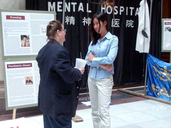 大楼一位警卫人员,第一天学员们就向他讲真象,他说知道法轮功学员、美国公民李祥春在中国被关押一事,但不知道受迫害的法轮功学员人数会这么多,波及的面积会这么大,镇压会这么惨烈。以后的每一天,他都来和学员们友好的打招呼,不时的来到展板前看看,甚至告诉学员们哪天政府人物会来大楼,哪个工作日人数会多。他对学员表演的功法大加赞赏,无法理解江氏集团怎么能忍心镇压这样一群善良民众。