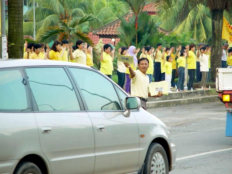 在法会第一天的下午,学员们在所住宾馆前面的人行道上炼功、发正念和举行烛光守夜。来往的车辆和摩托车很多,经过学员们时,很多都摇下车窗或停下来,接受学员送给他们的大法真象资料。晚上学员们進行了大组交流,大家交流了在各自国家和地区向政府、法律界及民众讲清法轮功真象和洪法的体会。
