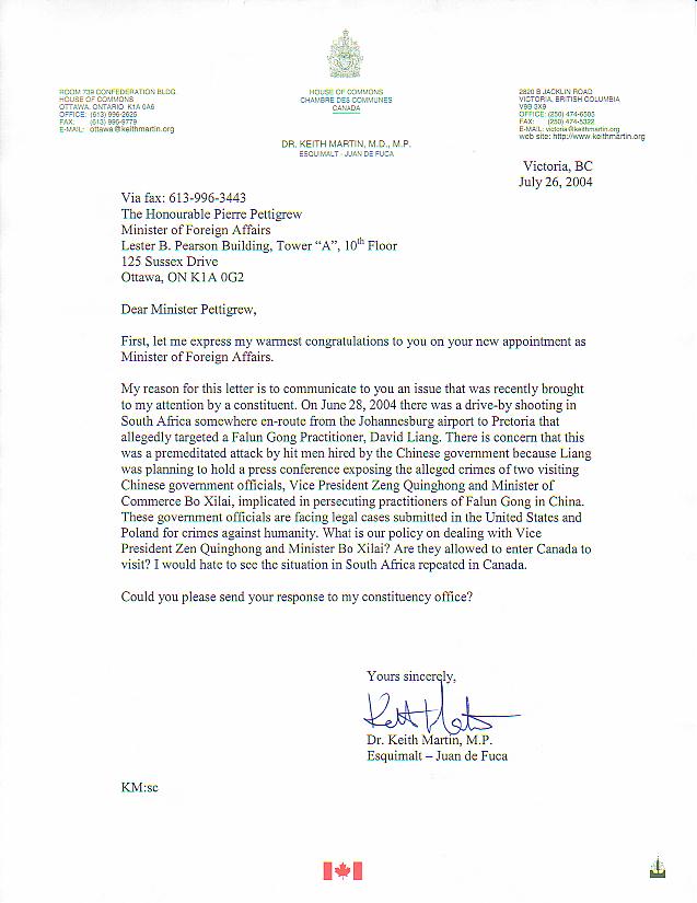 我致信阁下的目地是想就最近一位选民告知我的一件事情与阁下沟通一下。2004年6月28日,从南非的约翰内斯堡机场到比勒陀利亚的途中,发生了一起驾车枪击事件,据悉枪击目标是一名法轮功学员大卫-梁。这件事被认为是中国政府雇佣枪手策划的一起有预谋的攻击事件。原因是大卫-梁准备召开新闻发布会,以揭露两位来访的中国政府官员的罪行。这两位官员是中国国家副主席曾庆红和商务部长薄熙来,他们被指控在中国参与了迫害法轮功学员。这些政府官员目前在美国和波兰也面临着反人类罪的法律起诉。加拿大对曾庆红和薄熙来这两名官员持什么政策?他们是否能被允许進入加拿大访问?我不希望看到发生在南非的一幕在加拿大重演。