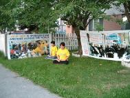 于是我们灵机一动:曾由几位老年同修亲手制作的用于加拿大法会的大展板,不是正好能让它再立新功吗?!于是几位同修一起把两块4X8英呎的大展板立在草坪上。为在安大略湖边讲真象用的十多块小展板,当闲置时,我们也把它们摆放到草坪上,展板内容从法轮大法在国内外洪传、国内外受到的褒奖,到在中国遭受的非法镇压、学员被迫害致死、起诉江魔头、江氏集团在南非雇凶暗杀……大小展板相互配合,我们在草坪上炼功,它们在向过往行人无声的诉说着真象。