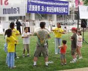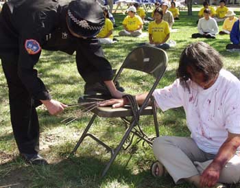 当天的天气晴空万里,气温凉爽。几十名法轮功学员在草坪上演示功法的宁静祥和,与真人演示的酷刑所展现的惨烈悲壮形成了鲜明的对比。高高竖起的巨大的中英文横幅“法轮大法——真善忍”,“这一切正在中国发生…”,“让我们一起结束这场迫害”,“公审江泽民”,在几十米外就清晰可见。西人学员的介绍配上略带哀伤的音乐,在扬声器中缓缓的向路人播放着,一下子就将人带入一种凝重的氛围。