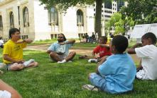 许多路人也被酷刑展深深的震撼了,很多人问“我们能作什么”,“如何才能帮助法轮功学员”。好几位美国人向学员索要了“我支持法轮功”的徽章,别在胸前,并说要这样戴一天。华盛顿当地的居民鲍比,在了解了法轮功的真象后,当场带着自己的四个孩子向学员学习炼功动作。一位新闻学院的学生在了解到炼法轮功的儿童受到的迫害后,泪水已充满了这个年轻男孩的双眼。