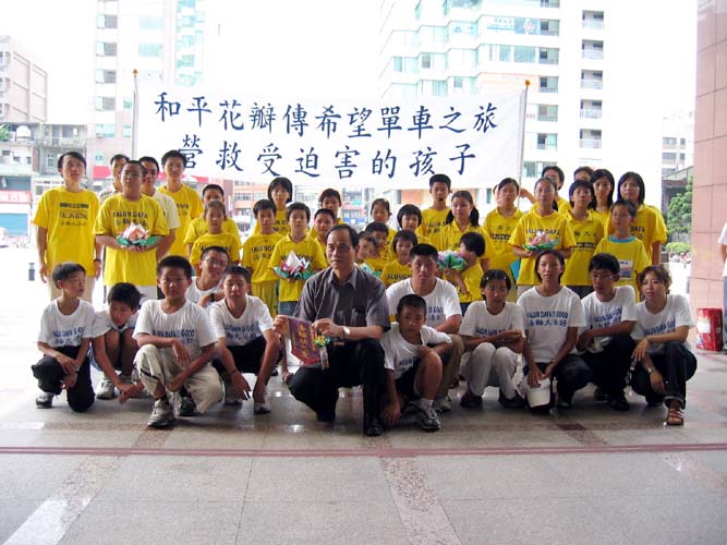 2004年8月9日早上,由台湾12位青少年组成的“营救受迫害的孩子”青少年单车之旅队伍抵达桃园。与当地的法轮功小弟子一起拜会县政府及县内文昌、青溪两所国中。并在桃园市区的东门形象商圈徒步区,進行折莲花传递希望及才艺表演的活动。获得黄副县长、校长、立委及民众的支持与敬佩。也让人们更加关注及了解中国大陆的儿童人权遭受严重践踏与迫害的情况。
