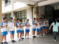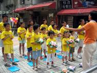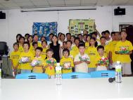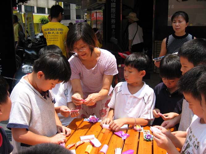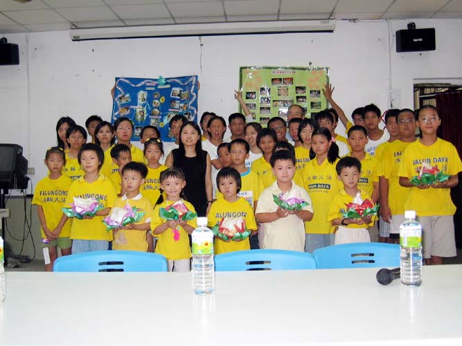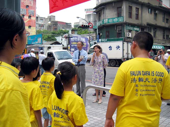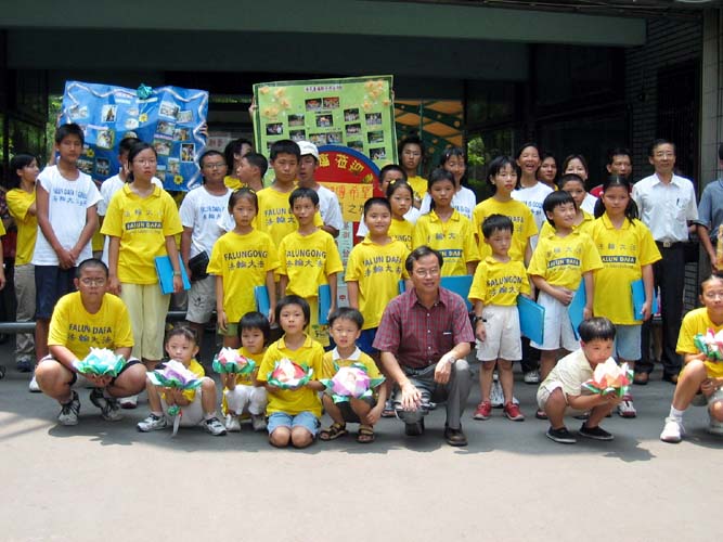 桃园郭老师一家四口,也参加今天的活动。太太表示,法轮功在台湾教育界受到普遍的欢迎,她的孩子就读的幼儿园举行毕业典礼时,园长主动邀请她设计一个法轮功的节目。她和儿子上台表演功法,郭先生在一旁介绍功法。一群小朋友在台下跟着炼动作,七张桌子左右的家长大都放下筷子专注的看。隔天有一位新兴工商的老师到炼功点上学功,说是亲戚在幼儿园的毕业典礼上看到功法表演回去说的。这让他们感到缘分的巧妙!