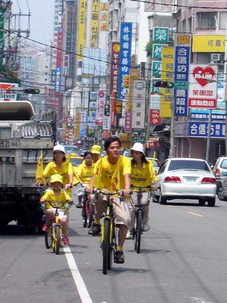 唐家两姐弟,一家四口都修炼法轮功。母亲原本罹患肠癌,炼了法轮功不药而愈。姐姐宾宾原本是气喘儿,炼了法轮功后,身心健康。弟弟赞赞,今年即将就读国小一年级,他是今天陪骑队伍中年纪较小的。虽然途中小脚踏车一度故障,他仍然在修好后,坚持继续骑下去。精神真是可嘉!