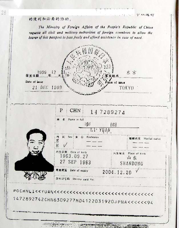 2002年7月5日我前往中国大使馆申请补办护照后,后又按约定日前去领取,结果窗口工作人员让我稍等片刻最后告诉我没给我批,问及理由,那人不明说,只暗示不用问我自己也应该知道为什么。要求他给我开拒发护照的理由书我好交给日本入国管理局补办入境手续,否则我将被日本政府当不法入国处置。他表示拒绝、无能为力,最后给我写了一个专管海外法轮功学员的官员名字与电话,也不知是否巧合,他写给我的居然是吴晓寅。我只好电话与吴联系,他推托是“上边”的决定,无法给我办理护照。我请他开拒发理由书,依然遭到拒绝,就这样,当我9月份签证过期,向日本政府重新申请签证时,日本政府简直难以置信中国使馆会不给开拒发护照的官方理由书,不明不白的结局使得日本入国管理局对我的情况展开了严密调查,我被当作不法入国的人员对我進行了一天的拘审,历经数月,经多方查证中国政府拒开理由书属实,以及我个人清白记录,出于我妻子是日本人,12月4日日本政府才给了我一张“在留特别许可”的特殊签证,我才恢复在日本的正常生活,若非妻子的日本国籍,不知命运如何。