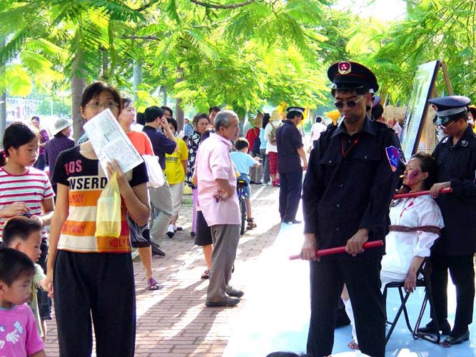 很多参观民众都震慑于这些血腥酷刑,有人仔细看完后,非常严肃的问:这些伤是真的还是假的?我告诉她们,酷刑展中的伤是用化妆技术表达的,但是这些事例在中国大陆是真的,而且还在持续发生着。听完后许多善良的民众都很惊讶也很难过,并表示要签名支持法轮功,反对正在中国大陆发生的这场人间冤案。