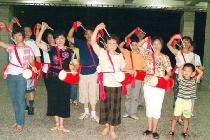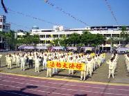 ![]() 集体功法表演 | ![]() 集体学法交流 | ![]() 作者(左二)正在为洪法练习腰鼓表演 |