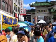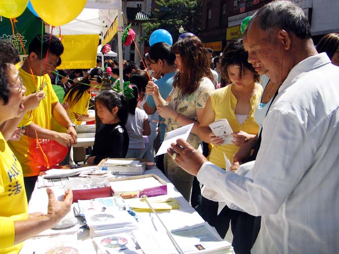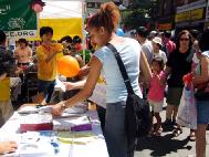 【明慧网2004年8月13日】2004年8月8日,波士顿法轮功学员参加了当地中国城中秋联欢节。学员们为游客们准备了多种中英文的法轮功真象资料和印有“法轮大法好”的氢气球,并通过教游客们折莲花的方式向人们讲清真象。摊位前围满了游客,有中国面孔的也有西方面孔,有大人也有孩子。有的认真的看着真象资料,向学员询问在中国发生的