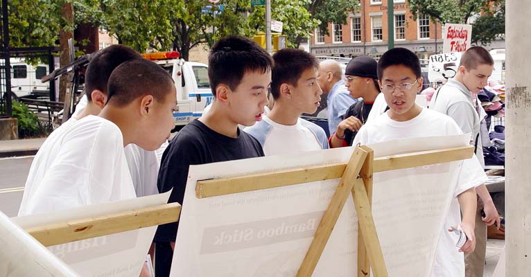 参加南街码头讲真象活动的有纽约和纽约邻近州的学员,还有台湾来的学员以及加拿大多伦多和蒙特利尔的学员。大家很自然的形成整体,互相自觉的取长补短。有做酷刑展的,有发传单的,有在边上炼功的,达到了很好的效果。特别是做酷刑展的学员,在烈日下坚持数个小时场面非常感人。