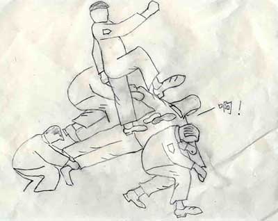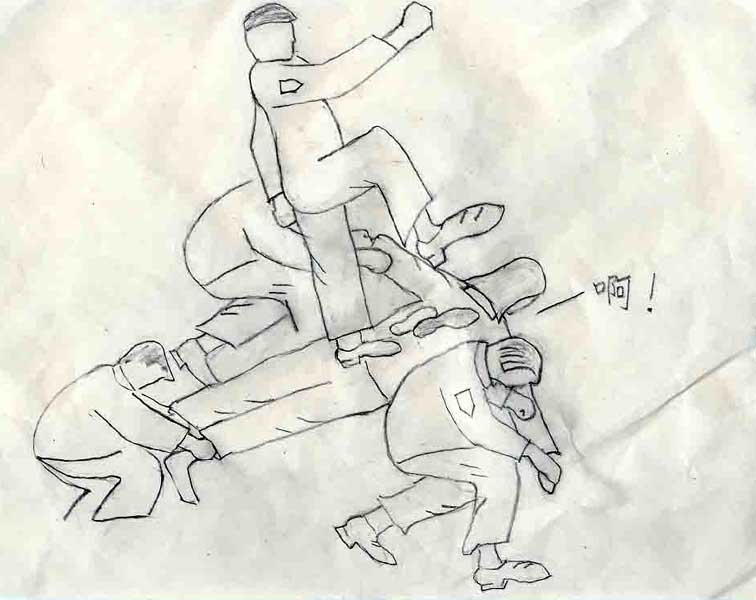图示:崔亚宁遭警察猛烈的蹬踩几个恶警抻开两臂、两腿将她俯卧在水泥地上。一个身高1米8多、体重200多斤的恶徒双脚离地站在她的背上,并猛烈地蹬踹(如图所示)。