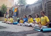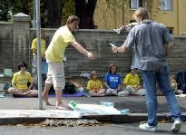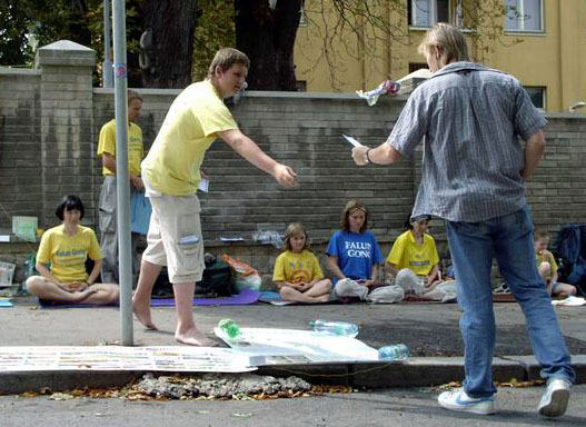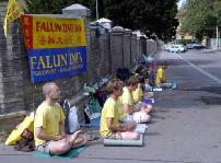 学员们没受此事和夏天的酷热所干扰,继续安静的打坐炼功。路人感兴趣的停下来阅读有关在中国发生的迫害。有些人还在请愿书上签名以示支持。一位女士甚至送给学员们一箱矿泉水帮他们解热。