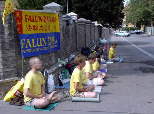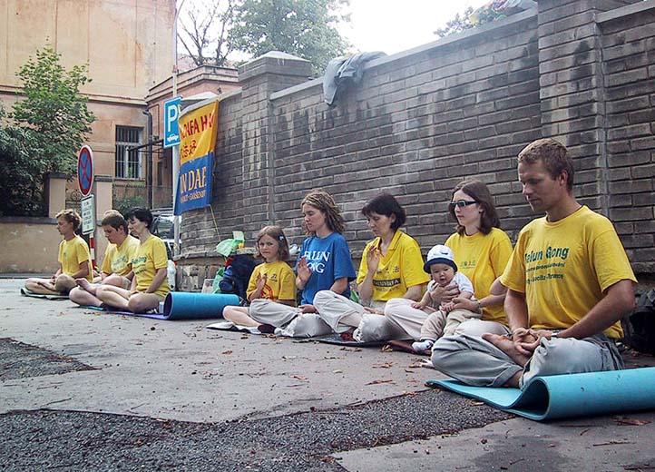 2004年7月20日是江氏集团开始系统迫害中国法轮功学员以迫使他们放弃对真善忍的信仰的五周年。来自捷克共和国的法轮功学员以在驻布拉格中国大使馆前和平打坐炼功36小时的方式,希望人们关注在中国发生的迫害。