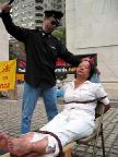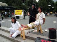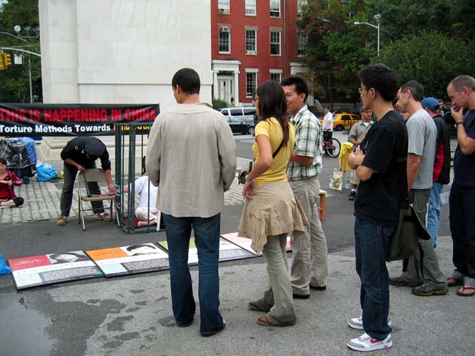 演示的酷刑中,有被警察强迫灌食的浑身被捆绑流血的妇女、有被吊起来关在笼子里满脸痛苦表情的老人、有被尖尖的竹签刺进手指正流血不止等等,旁边还有图片说明,人们看到这一幕幕惨不忍睹的画面,被惊呆了!不少人问:“这是真的吗?在那里发生?为什么要迫害?”不敢相信现在在世界上还发生着这样残忍的迫害,而且是对一群打坐修炼“真善忍”的善良好人。