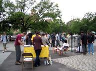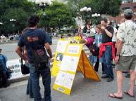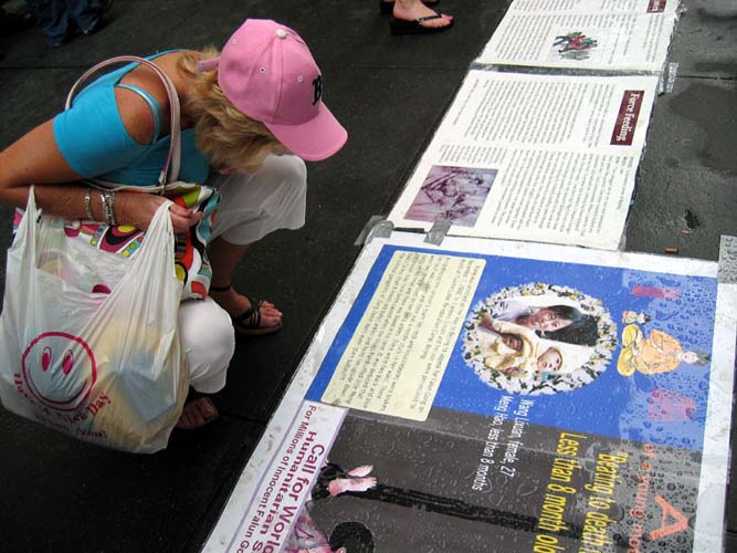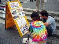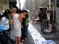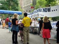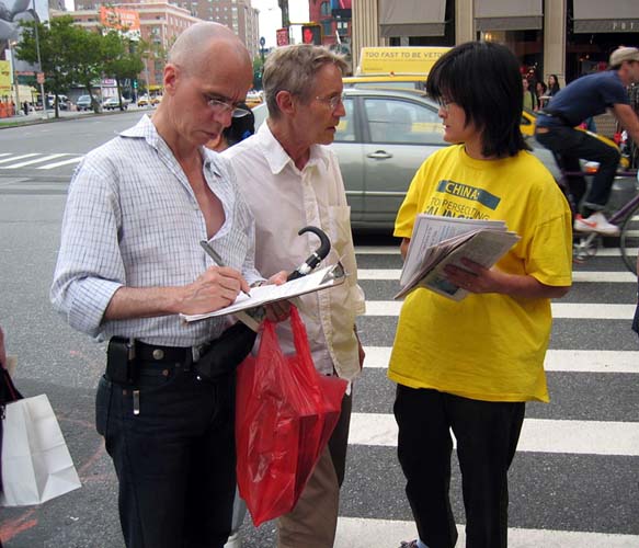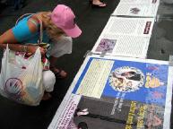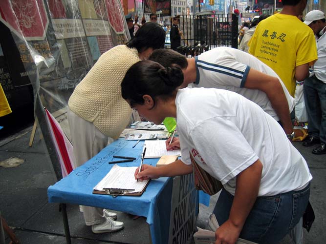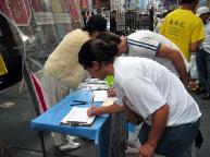 有的人流着泪看完展板介绍法轮功学员在中国遭受的酷刑折磨。人人纷纷在谴责江泽民集团对法轮功学员的迫害本上签名,呼吁立即停止迫害。