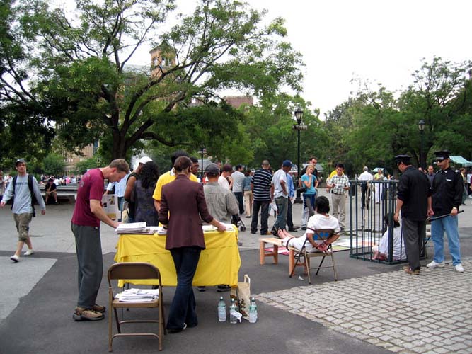 一在百老汇大道扮演打手的警察说:“想一想很可怕,我拿电棍勒老人脖子的手稍一用劲,就会把人勒死的。真想对中国的警察说一句,不要再充当江泽民的打手了,人要有良心,家里都有父母妻子儿女,要为自己也为家人着想,自古说善恶必有报呀。”