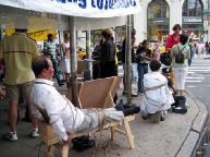 很多路人拿出相机把一幕幕惨状拍下来。一位住在附近摄影师看到酷刑后,特意回去取来照相机,不一会就带来他拍好的酷刑照片,把酷刑醒目的展现出来,让更多的人通过照片知道真象。他说两年前他就见到过法轮功学员在纽约中领馆前的和平请愿,后来还在巴黎见过更多学员参加的活动。