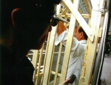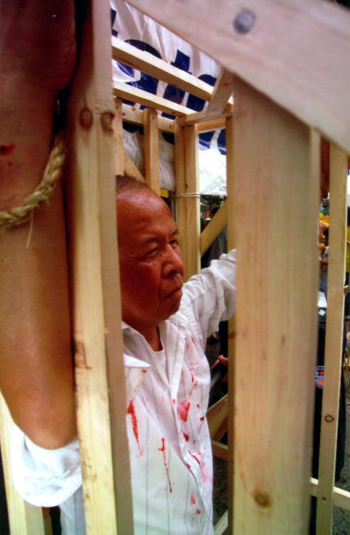 扮演被关在笼子里被绑被吊的老人已经站了一个多小时了,他儿子因炼法轮功被关押了1年半,很多酷刑他儿子都遭受过。