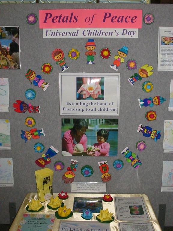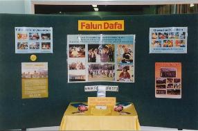 我们在资料桌上放有《法轮功》和《转法轮》,还有教功带,真象资料以及纸折莲花。展板上贴着介绍功法的彩色海报,地区活动的图片等。我们向人们讲述在中国发生的对法轮功的镇压,对成千上万无辜的法轮功学员的迫害。