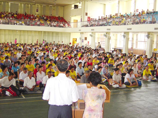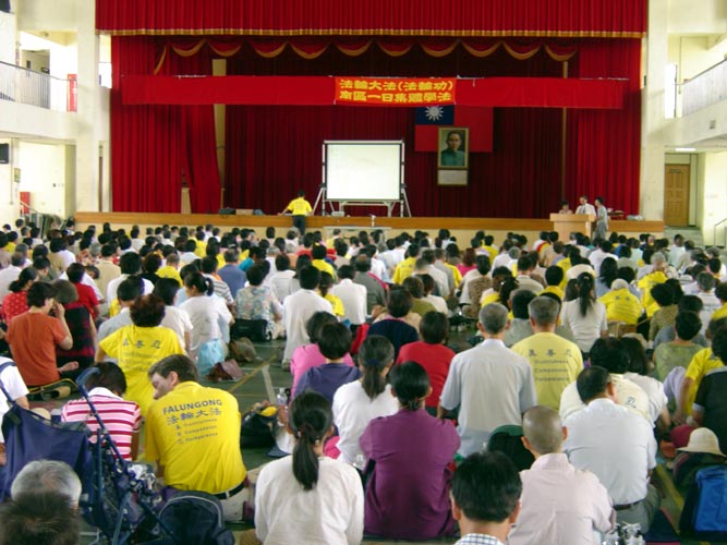 2004年8月15日在台南市东光国小举行一日集体学法交流会,上午分30组小组交流,每组30人参加,下午全体学员在大礼堂交流。有来自台湾南部各地千名学员参加,整个会场座无虚席。上午学完法后,开始交流,很多学员说出自己在祛病健身、心性提升和讲真象洪法的小故事,说到精彩的地方掌声如雷,振奋着人心,触动在场的学员发出更坚定实修的决心。