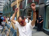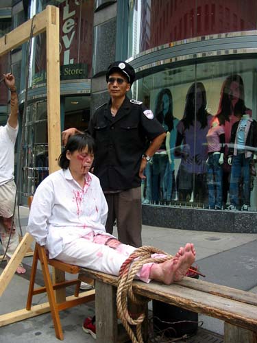 这是法轮功修炼者在曼哈顿街头演示的真人酷刑展。他们所表演的内容现在正在中国真实的发生着。