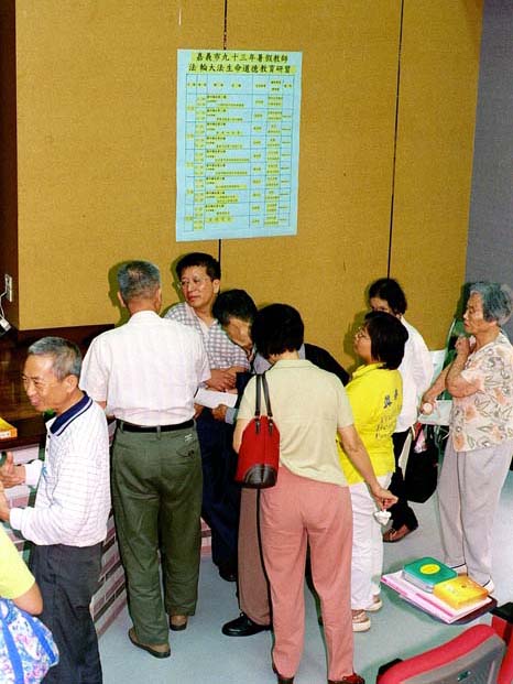 研习课程是从每天上午8:30至为下午4:30,兰潭国小赖校长开幕致词,嘉义市教育局林局长莅临会场。中间午休时段,当研习人员向法轮大法学员请教一些他们长久以来一直藏在心中的疑问时,学员都很热心的从旁协助他们了解人生的一些困惑,有的人且当场激动的哭了起来,诚然,迷惑了的人们,一朝得闻宇宙真理,这种万古机缘一旦碰上,要说无动于衷也难。