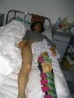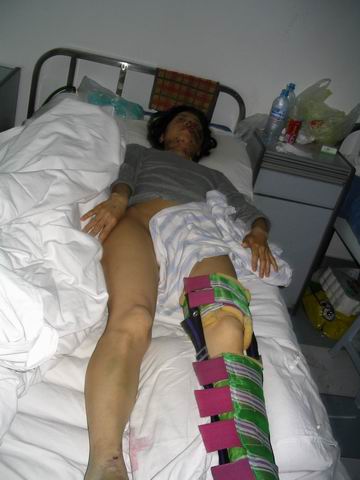 高蓉蓉5月7日遭受惨无人道的迫害后,被迫从二楼狱警办公室窗户跳下,造成骨盆、股骨头、腿部等多处骨折。图四是高蓉蓉受伤第8天的情况。因环境所限,所用相机也不是太好,照得不清晰,但也可以看出脚脖处的电击伤,两只脚都有,比照片上严重,侧面的电伤面积大,没拍到;右小腿迎面骨上可以看出踢伤,左腿的小腿、特别是大腿处面积更大;医院诊断为骨盆两处断裂,左腿严重骨折,右脚跟骨裂。因身体太虚弱,医生无法進行手术。