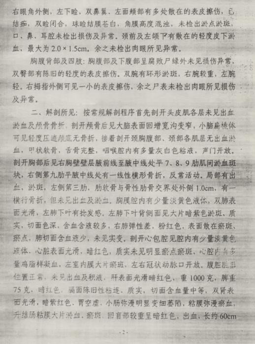 2000年12月13日,在吉林市公安局对王立新的遗体進行了解剖检验。据解剖检验结果,王立新明显消瘦,肋骨骨折和胸部淤血斑块,“左肺下叶背面大片暗紫色瘀斑”,“小肠弥漫明显变细萎陷,粘膜弥漫瘀血,升结肠粘膜大片淤血,瘀斑,回盲部较重呈暗红色,出血,长约60cm范围,肠系膜淋巴结肿大”。法医最后诊断为:1、急性脑水肿、肺水肿、脑疝;2、全身炎症反应综合症;3、小叶融合性化脓性肺炎。