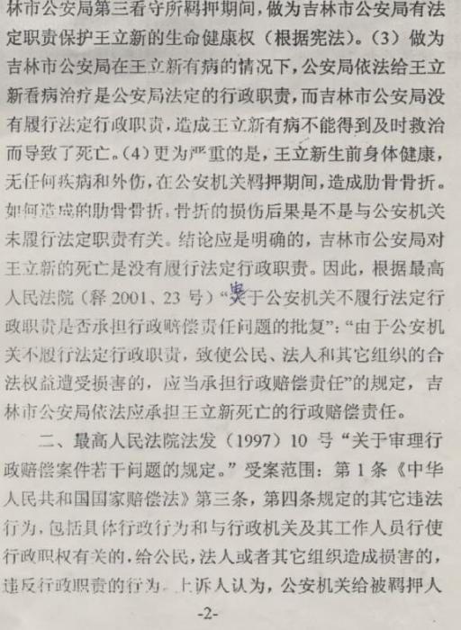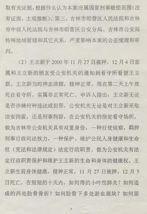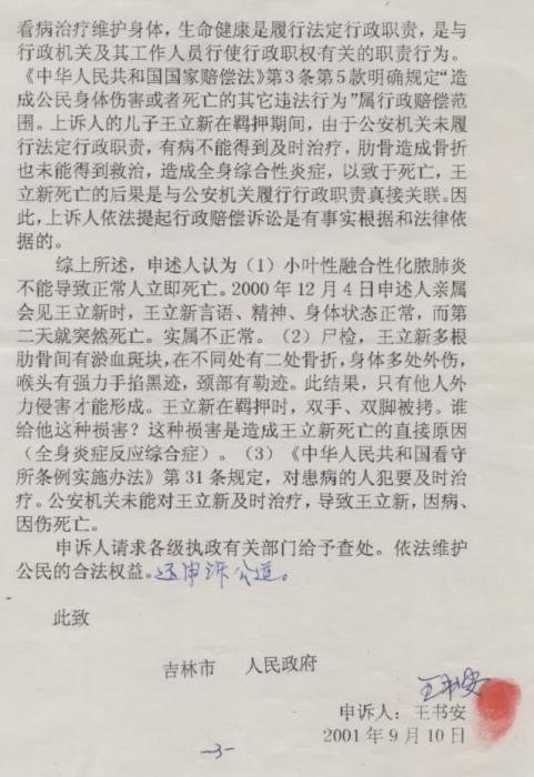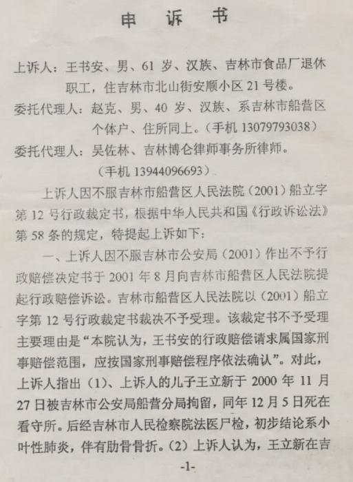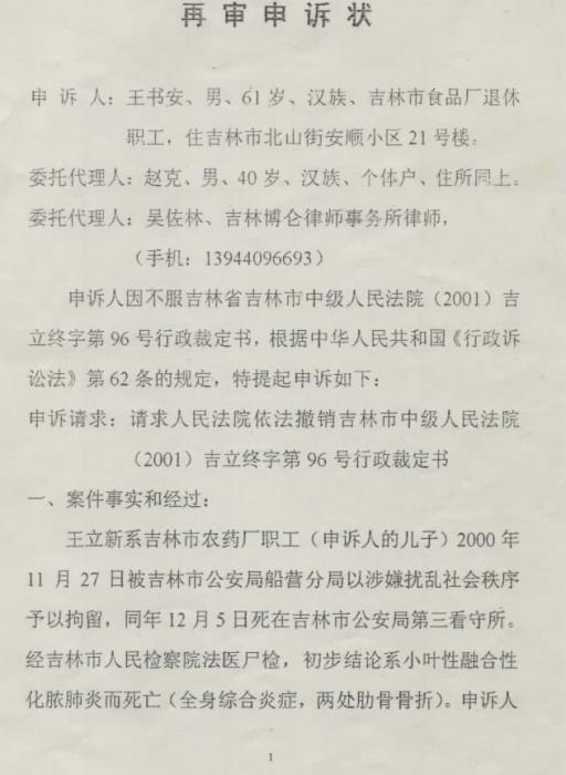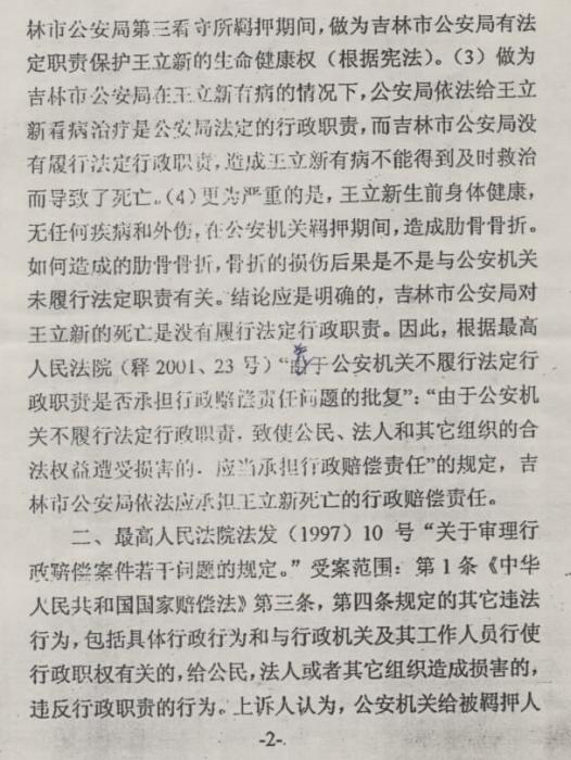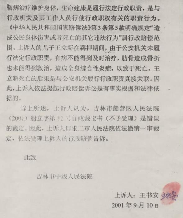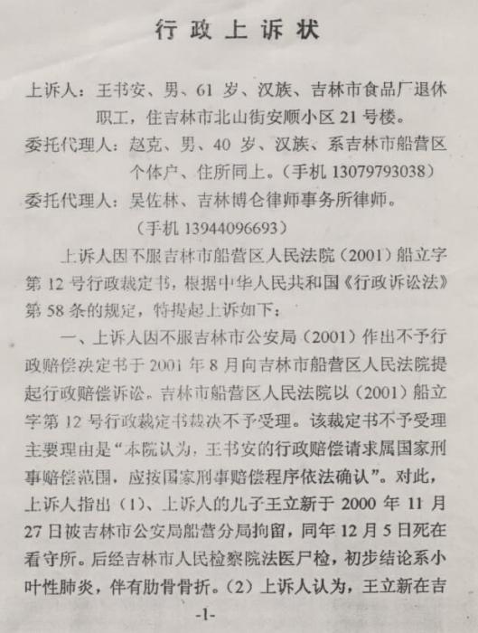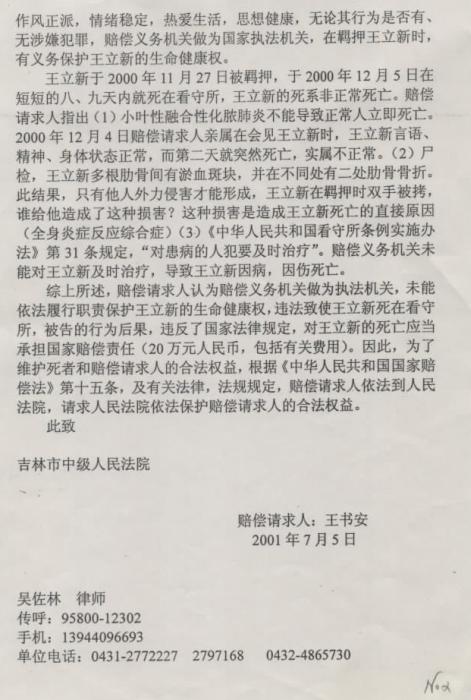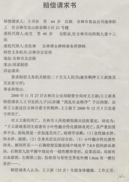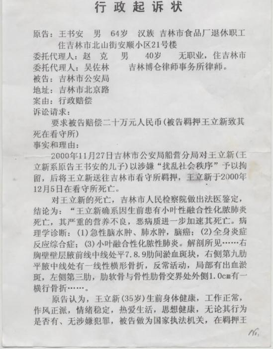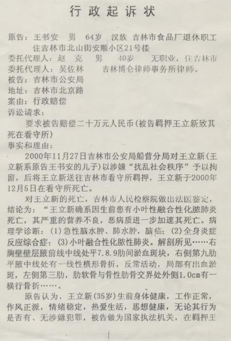 王立新于2000年11月27日被羁押,于2000年12月5日在短短的八、九天内就死在看守所,王立新的死系非正常死亡。2001年6月王立新的父亲王书安依法向吉林市中级人民法院提起了行政起诉,诉讼要求被告(吉林市公安局)赔偿20万元人民币。