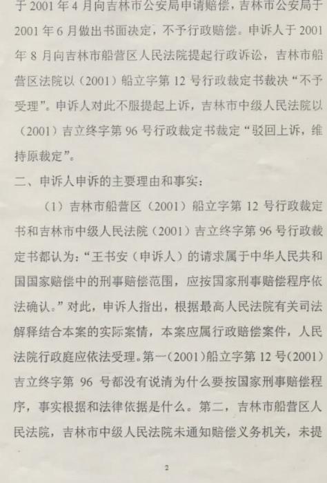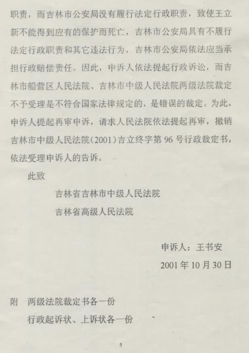 2003年10月30日,鉴于吉林市船营区人民法院和吉林市中级人民法院不受理起诉,王立新的父亲王书安于向吉林市中级人民法院以及吉林省高级人民法院提出再审申诉。