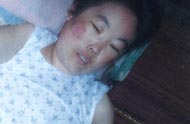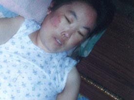 回来后,我双手肿得象馒头一样,家人来看时,暴徒们还气愤地对我爱人说:“她太顽固,打她。”看到我受伤害的情况,我爱人的眼睛都湿了。