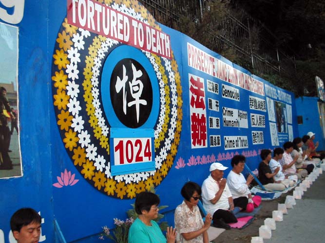 这个请愿地点布置着中国式的一个悼念的场景,鲜花包围着一个中文字“悼”。意思是表达对死者的悼念和敬意。还有横幅,呼吁人们起诉江泽民及其随从的群体灭绝罪和反人类罪。江在中国宣布这个在全世界拥有上亿炼功人的法轮功群体不合法。