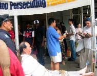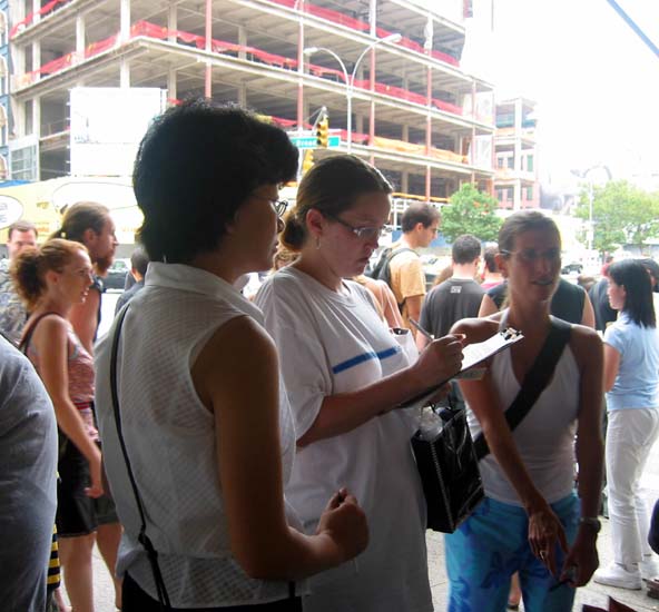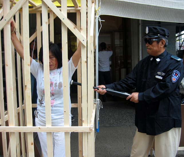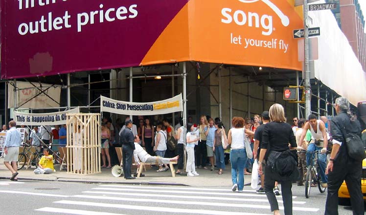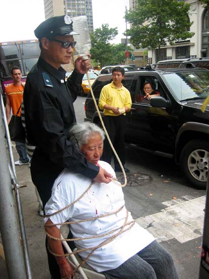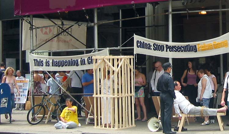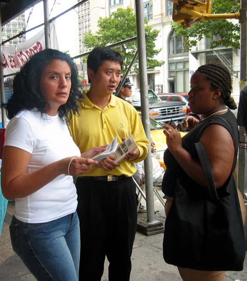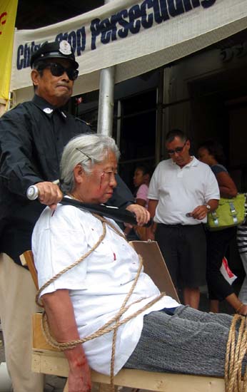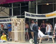 【明慧网2004年8月22日】(明慧记者苏晶报道)自今年8月以来,法轮功学员在纽约曼哈顿闹市街头举办了一系列讲清真象的活动。多处人潮密集的地方都有真人模拟展,向民众展示在中国江氏集团用以无辜法轮功学员的残忍手段。