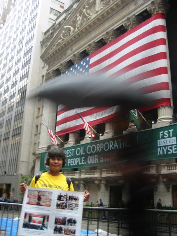 4、发正念清场和发资料讲真象同样重要。记得8月16日那天刚刚到华尔街时,人们都很麻木,很少人拿真象资料。开始我们动了一念,我们还是到水街去吧,那里路人没有这里多,但是要真象资料的人多。这里人多,但是要真象资料的人少。当时虽然没有看见从地下冒出的一股柱状黑气,和在上方形成一个伞状的盖,但是马上意识到,我们不能走。就这里需要清场。然后一位学员找了一个高处,打开炼功音乐,盘腿打坐,炼一个小时静功后,看到发资料速度快多了。同时来了一位英语好的DC学员,不停的解答人们的问题,真象资料发得很快。由于感觉非常好,她又盘腿打坐,并打开普度和济世音乐。这时,有人过来详细看真象展板。还有人来问她炼的是什么,到哪里可以学。得到真象资料后非常高兴,发自内心的说:“谢谢,谢谢。”我们理解:有大法弟子在,邪恶就被清除,人们就开始清醒。既然海外的邪恶聚集到了纽约,有条件安排开手里工作的学员,尽量到纽约去。把大法弟子的正念场带去。
