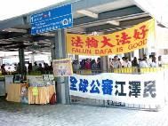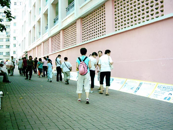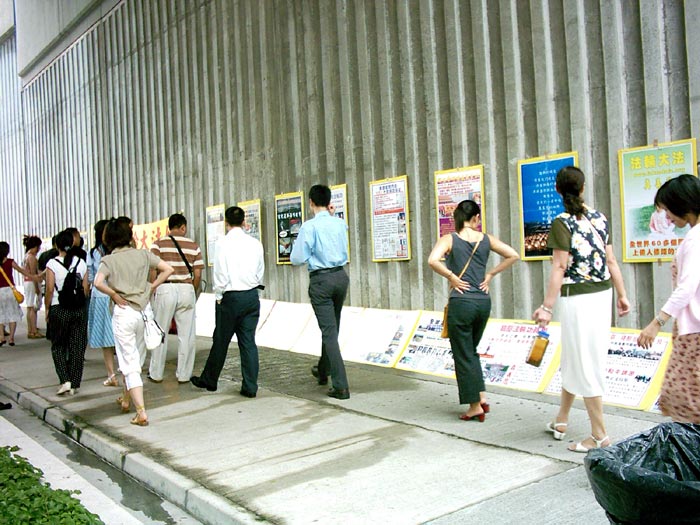 看到法轮功学员被迫害的图片,甚至连八个月大的婴儿都被折磨致死时,他们露出了不忍的表情。再听到学员讲:“江××迫害法轮功已经引起全球的关注,严重影响国家形象,江在许多国家被起诉!自己的同胞受迫害,我们不是更应该关心吗?我们是法轮功的受益者,自己出钱出力来这里,请大家一起来制止这场迫害。如果修真、善、忍的好人都被迫害,那我们的生活还有保障吗?”人们不住的点头。他们看到在一旁打坐的法轮功学员,也相信这些人都是好人。