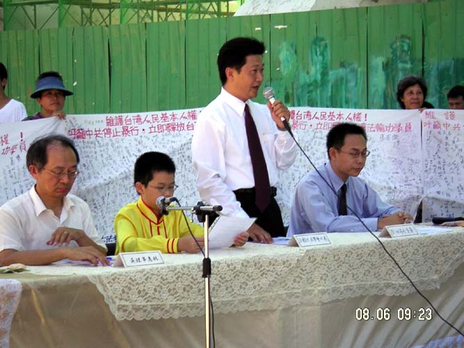 8月14日抵达云林县斗六市火车站,记者发布会中张硕文先生代表来宾致词时表示:久闻法轮大法的玄妙及好处,家姊也是法轮功学员,将来有一天自己也可能成为法轮大法的修炼者,希望对岸江氏集团停止对法轮功学员的迫害,因为教大家做善良好人的法轮大法真的好!