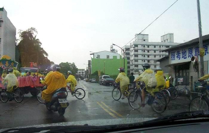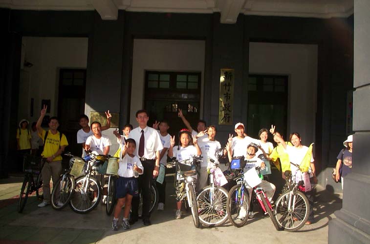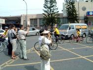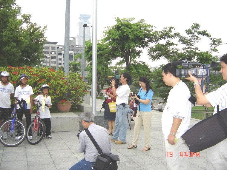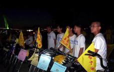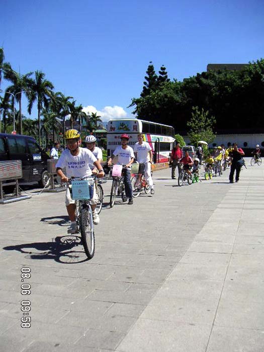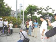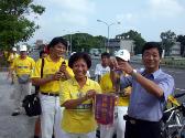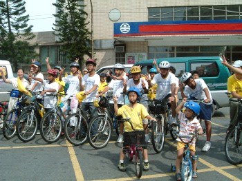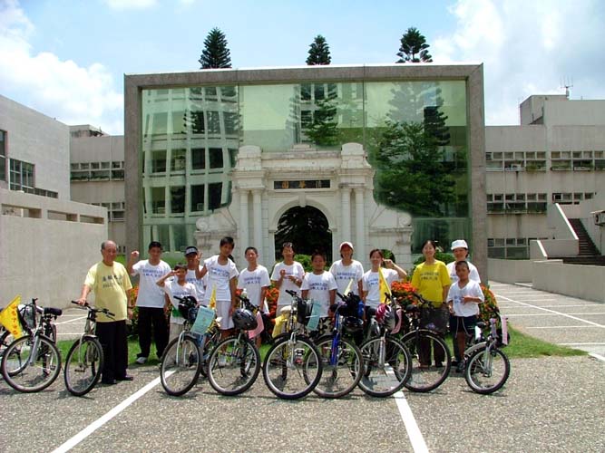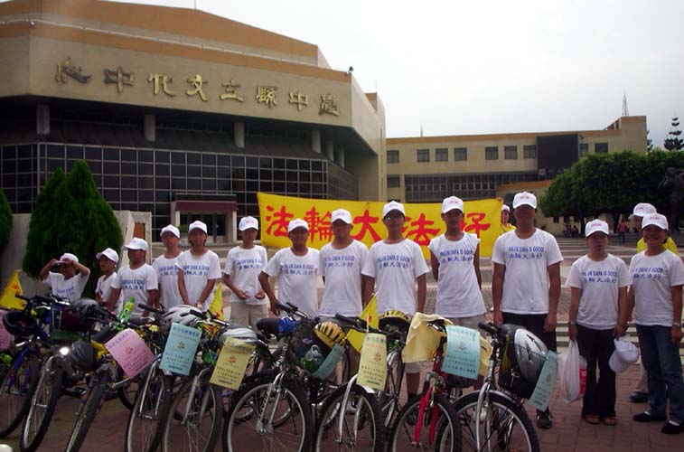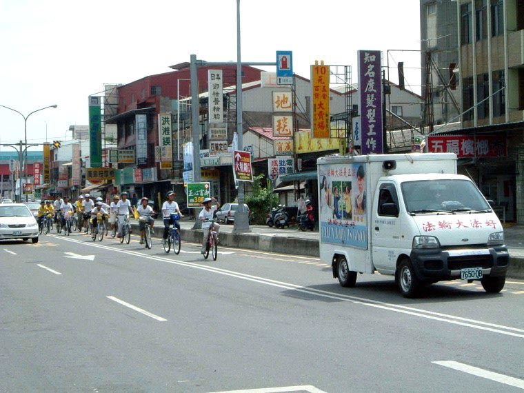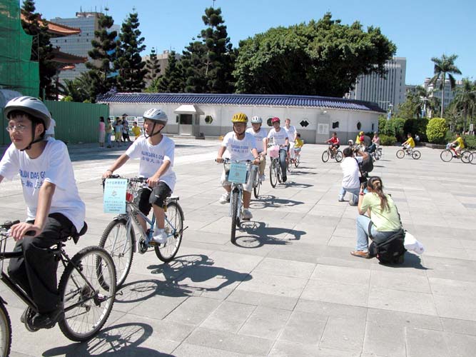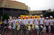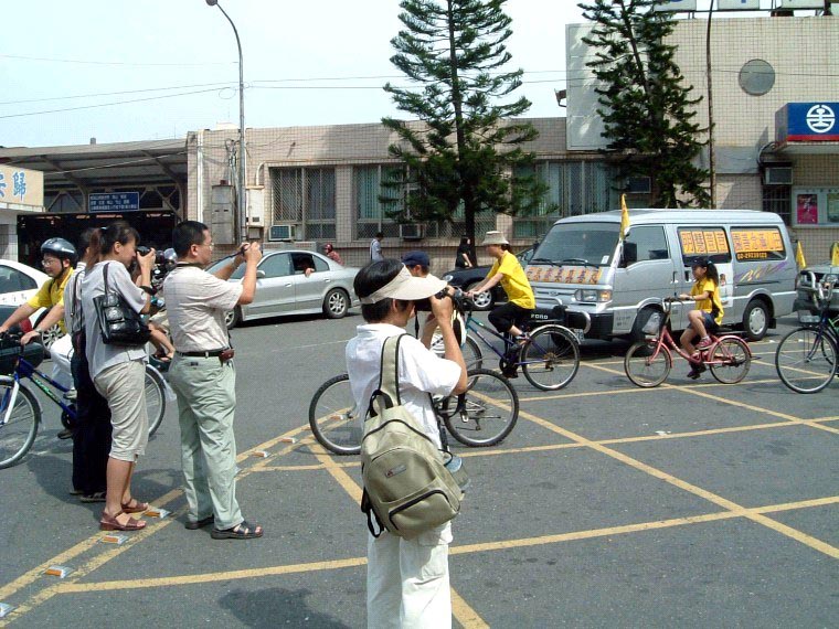 十五日青少年单车队伍绕行嘉义市区,吸引了街道两旁的人车民众的眼光。在“普度”“济世”音乐声中,学员沿途派发传单及适时的向民众讲真象。当民众知道这些小弟子青少年是从台北骑下来,活动的目地是希望呼吁大家营救在中国因修炼法轮功而被迫害的孩子时,脸上的表情既惊讶又感佩。