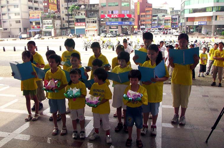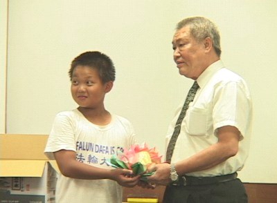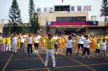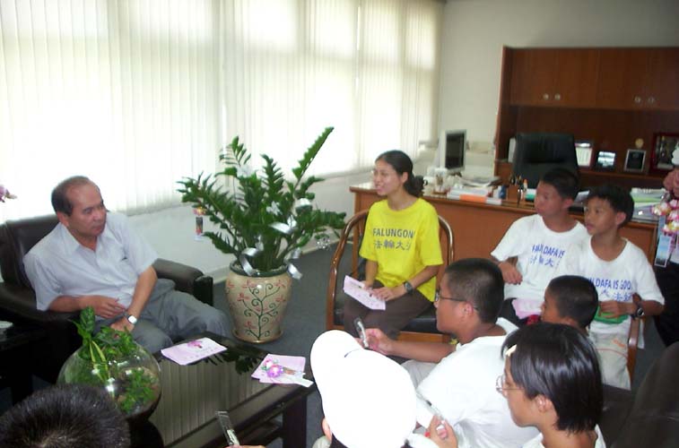 下午到高雄市的明星学校──五福国中去拜会陈校长。陈校长微笑着和善的摸摸每位队员的头,同时逗趣的猜他们的年龄,陈校长说:“当你们进入学校时,我观察到你们的行为和态度与一般孩子不一样,法轮功的真、善、忍真的不是口号啊!我要向各位恭喜!真善忍这个大目标不仅是陶冶小孩,也包括大人,让我们把这正义的声音与行动推向全世界,他是全世界的活动。 中国大陆没有人权,对法轮功很残忍,只要我们把这讯息传出去,力量是很大的,暴政是不容许存在的。”