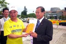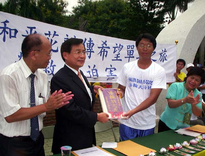 ![]() 拜访台中县立文化中心 | ![]() 台中县长接受学员致赠《转法轮》 |