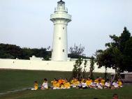 恒春是国际知名的景点,在当地法轮功学员的陪骑下,队伍绵延甚长,吸引人们的目光,也使有缘人能进而了解法轮功真象。在夕阳余晖的映照下抵达鹅銮鼻公园灯塔炼功、发材料,巧遇两团中国游客,法轮功学员亲切的欢迎他们,获得他们善意的回应。
