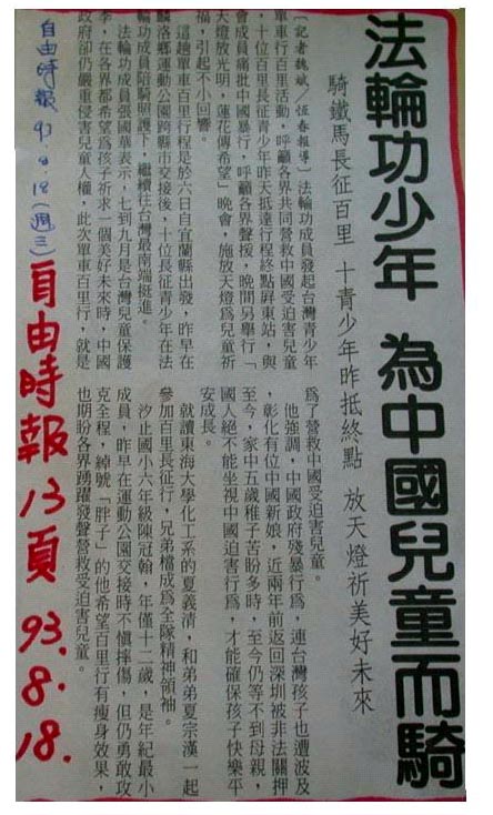 台湾 “营救被迫害的孩子──青少年单车之旅活动”,为呼吁世人共同关注中国大陆的儿童人权遭受严重践踏,这一跨国性的活动,已有澳洲、美国、加拿大、日本等地的青少年热情参与,希望让各国的人们了解孩子们修炼法轮功,可以获得健康的身体与端正的品格,学业表现也有大幅的进步。同时揭露中国江泽民犯罪集团对法轮功的诬蔑,和对孩子们的残酷迫害。