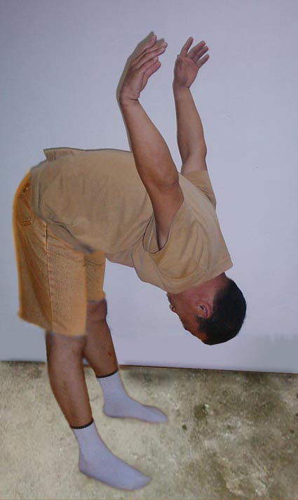 此种迫害发生在沈阳张士教养院和龙山教养院等地,是教养院常见的迫害手段。动作是弯腰低头向下倒控,两腿分开,双臂向后上扬。