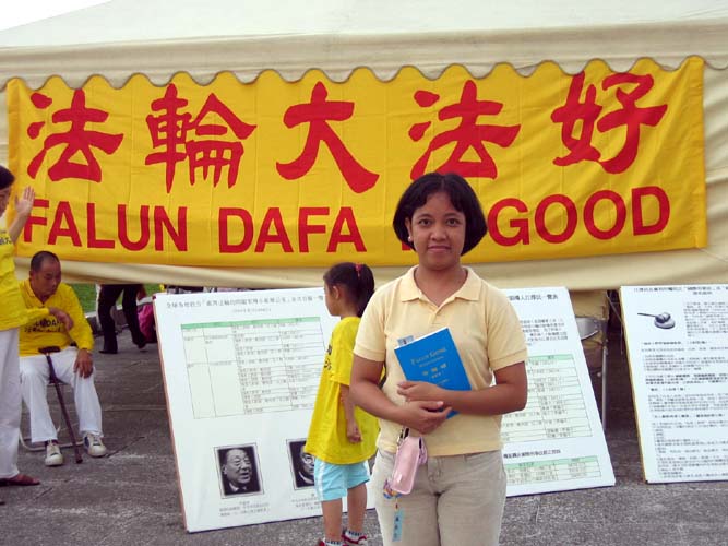 我与母亲是2002年11月得法的,一天,当Vangie看见母亲围着绣有“法轮大法”中英文字样的围巾时,她睁大着眼、捂着胸口说“Falun Dafa、怕怕”,母亲跟我转述这件事,并说:来台几年Vangie都有看英文邮报的习惯,是不是受到转载自中国媒体的谎言所蒙蔽,而对大法有负面的印象。于是,我先生拿了英文版的《转法轮》与法轮大法简介和一片真象VCD送给Vangie。她不但明白了真象,况且亲眼目睹,几年来行走不便、医师判定须换人工膝关节的母亲,在短短的二、三个月的修炼中,便有了明显改善。使她对于法轮功有了更进一步的认识。