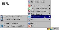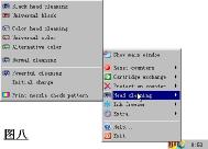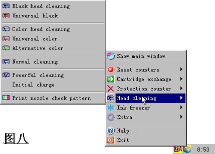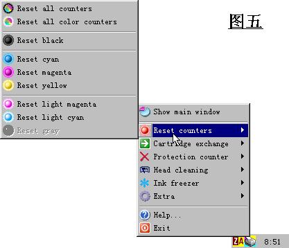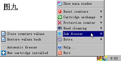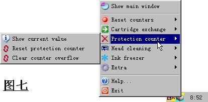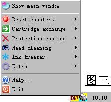 程序下载安装完毕后会在屏幕的右下角出现图二所示的打印机样式图标。 在该图标上点击右键,则会出现程序所有功能(图三)我们可以直接利用这些功能对墨盒进行破解。