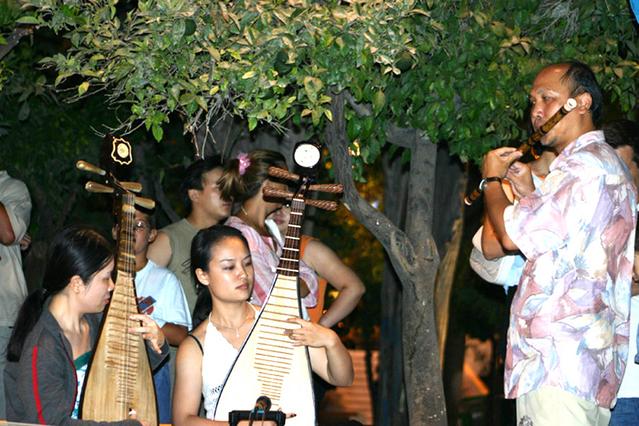 除了展示法轮功功法以及让人们明白迫害真象外,法轮大法学员也为雅典市的人们表演音乐节目及舞蹈,一名来自台湾的表演者展现甜美的舞姿,一群女士搭配“莲花颂” 歌曲表演伞舞。还有学员演奏中国传统乐器及歌唱,来自德国的学员则演唱“法轮大法好”。大批群众深受这种小型的户外音乐会的吸引。