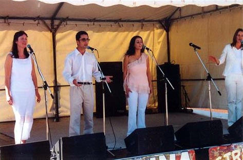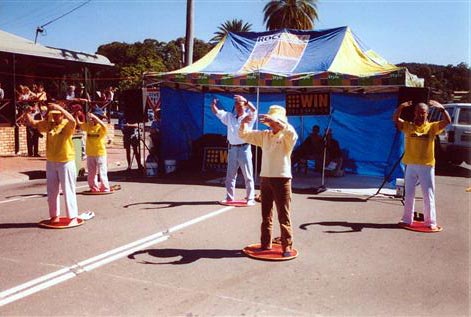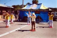下午,学员在街边的舞台上進行了20分钟的功法演示,接下来还为数百名观众表演了歌曲和中国传统舞蹈,受到观众的热烈欢迎。由西人学员组成的五重唱歌咏队也上台为大家演唱了他们自己谱写的歌曲,通过他们的歌声把中国法轮功学员遭受迫害的真象告诉给广大民众。他们演唱的最后一首歌“回归”,歌颂了大法弟子通过在法轮大法中修炼返本归真的美好。参加演出的还有两名年轻的华人学员,她们那绚丽的服装和优美的舞姿也赢得观众们热烈的掌声。